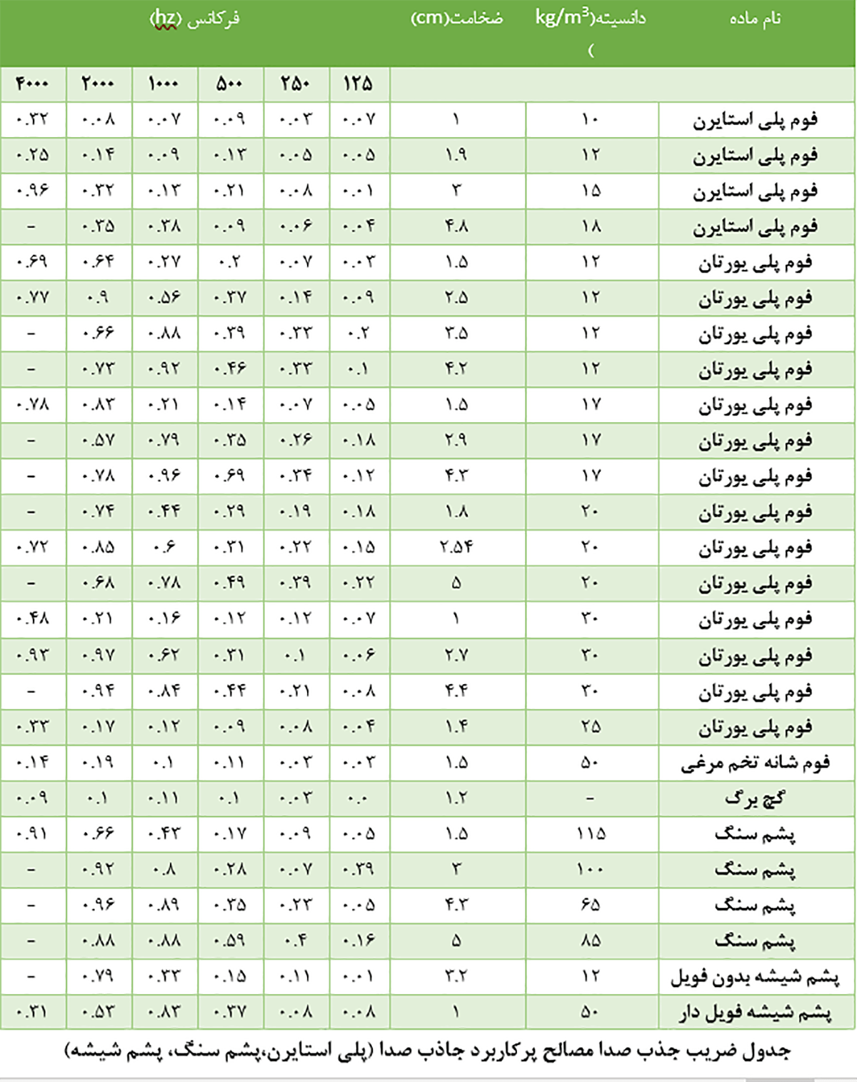 ۷- ضریب جذب عایق های صوتی متداول در بازار ایران که به جهت عایق بندی سازه LSF ال اس اف استفاده میشوند، در طیف فرکانسی (۴۰۰۰-۱۲۵هررتز) در دانسیته و ضخامت های مختلف در جدول زیر به نمایش درآمده است.