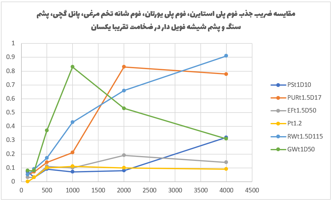 در نمودار بالا رفتار فوم پلی استایرن، فوم پلی یورتان، فوم شانه تخم مرغی، پانل گچی، پشم سنگ و پشم شیشه با ضخامت تقریبا یکسان در طیف فرکانسی مختلف مورد بررسی قرار دادیم. در فرکانس زیر ۵۰۰ هرتز به ترتیب پشم شیشه>پشم سنگ>فوم پلی یورتان>فوم شانه تخم مرغی>پانل گچی>فوم پلی استایرن ضریب جذب صوت بیشتری دارند. از فرکانس ۵۰۰ تا ۱۰۰۰ هرتز به ترتیب پشم شیشه>پشم سنگ>فوم پلی یورتان>پانل گچی > فوم شانه تخم مرغی >فوم پلی استایرن ضریب جذب صوت بیشتری دارند. از محدوده فرکانس۱۰۰۰ تا ۱۶۸۴ هرتز نیز به طور میانگین پشم شیشه>پشم سنگ>فوم پلی یورتان>فوم شانه تخم مرغی>پانل گچی>فوم پلی استایرن ضریب جذب صوت بالاتری دارد. از فرکانس ۱۶۸۴ تا فرکانس ۲۷۵۸ هرتز به ترتیب فوم پلی یورتان>فوم پلی یورتان>پشم شیشه فویل دار>فوم شانه تخم مرغی>فوم پلی استایرن>پانل گچی ضریب جذب بیشتری دارند.از فرکانس ۲۷۵۸ تا ۳۰۱۳ هرتز به ترتیب فوم پلی یورتان>پشم سنگ >پشم شیشه فویل دار>فوم شانه تخم مرغی>فوم پلی استایرن>پانل گچی ضریب جذب صوت بیشتری دارند و از فرکانس ۳۰۱۳ هرتز به بعد پشم سنگ>فوم پلی یورتان>پشم شیشه فویل دار>پلی استایرن>فوم شانه تخم مرغی>پانل گچی ضریب جذب صوت بیشتری دارند. از نمودار بالا می توان نتیجه گرفت پشم سنگ به بالاترین مقدار ضریب جذب صوت در فرکانس ۴۰۰۰ هرتز رسیده است و در کل طول طیف فرکانسی روند صعودی و مطلوبی داشته است. پس از پشم سنگ فوم پلی یورتان نیز در فرکانس های بالاتر از ۲۰۰۰ عملکرد مطلوبی دارد. در فرکانس های زیر هزار پشم شیشه فویل دار عمکرد مطلوبی را از خود نشان داده است.