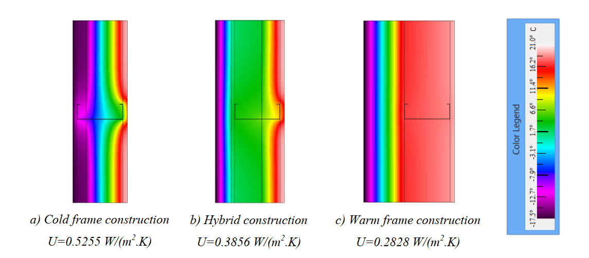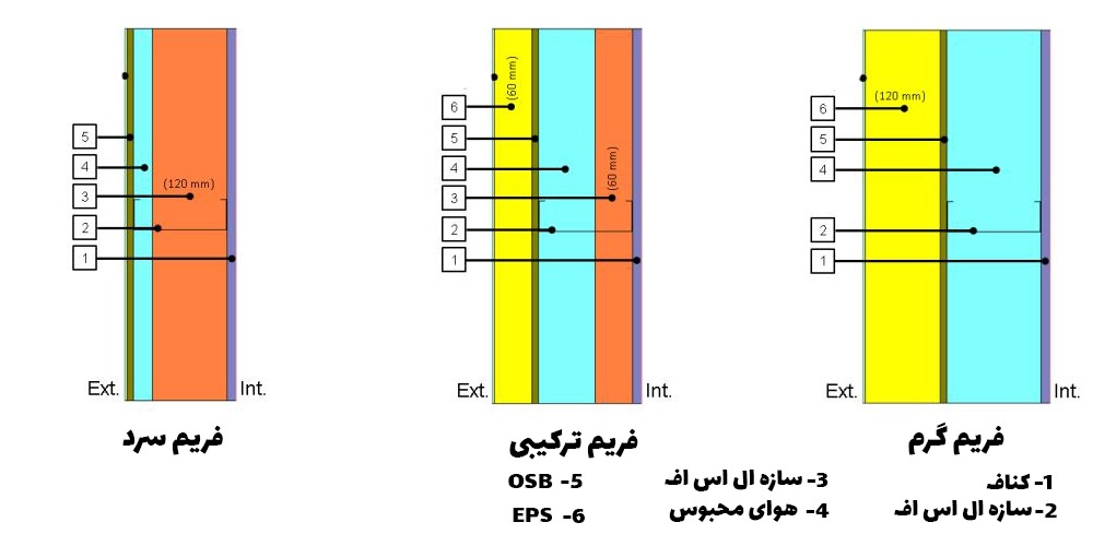 با توجه به رفتار حرارتی، المان های ساختمانی سازه ال اس اف LSFمعمولاً بر اساس محل عایق حرارتی طبقه بندی می شوند. شکل زیر سه نوع روش ساخت فریم سازه ال اس اف LSF را نشان می دهد: فریم سرد، فریم ترکیبی، فریم گرم. در ساخت فریم سرد، عایق حرارتی در داخل دیوار بین استاد های فولادی قرار می گیرد. بنابراین، این راه حل ممکن است در آب و هوای سرد، با توجه به دمای پایین تر پروفیل های فولادی بیشتر مستعد میعان داخلی شود. علاوه بر این، پلهای حرارتی فریم های فولادی در این نوع بارزتر هستند و منجر به اتلاف و افزایش حرارت میشوند. هنگامی که عایق حرارتی بین سطح خارجی و هوای محبوس دیوار بین پروفیل های فولادی توزیع می شود، فریم سازه ال اس اف LSF به عنوان ساختار ترکیبی طبقه بندی می شود. در این نوع، حداقل یک سوم از مقاومت حرارتی باید در خارج از هوای محبوس دیوار قرار گیرد تا از پل های حرارتی و خطر میعان داخلی کاسته شود. در نهایت، در سیستم فریم گرم، تمام عایق حرارتی در خارج از سازه فولادی قرار می گیرد که بهترین عملکرد حرارتی را دارد. با این حال، این نوع دیوارهای ضخیمتری ایجاد میکند که ممکن است منجر به مساحت خالص کمتری شود.