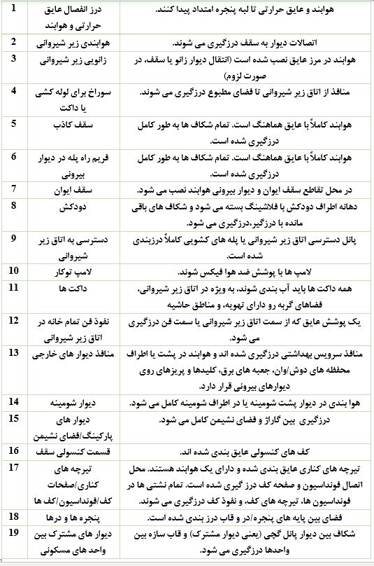 جدول زیر چک لیست نقاط بحرانی نشت هوا در ساختمان را نشان می دهد، لازم است مجریان و سازندگان سازه ال اس اف به این چک لیست توجه ویژه داشته باشند: