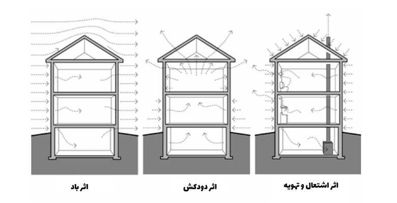 هر زمان که نفوذ وجود داشته باشد، در جای دیگری از ساختمان نفوذ متناظر وجود دارد. در زمستان، این موضوع می تواند منجر به حرکت هوای گرم و مرطوب داخل خانه به داخل حفره های پوشش ساختمان شود. در هر صورت، میعان می تواند رخ دهد و در نتیجه کپک یا پوسیدگی ایجاد شود. نفوذ توسط باد، اثر دودکش و تجهیزات مکانیکی در ساختمان ایجاد می شود. باد فشار مثبتی بر روی وجه بادگیر و فشار منفی بر روی دیوارهای رو به باد غیر بادگیر ایجاد می کند که هوا را از ساختمان خارج می کند. باد باعث نفوذ در یک طرف ساختمان و خروج از طرف دیگر می شود. اثرات باد می تواند بر اساس زمین اطراف، بوته ها و درختان متفاوت باشد.”اثر دودکش” زمانی است که هوای گرم در ساختمان به سمت بالا حرکت می کند. این در تابستان و زمستان اتفاق میافتد، اما در زمستان بیشتر مشخص میشود، زیرا اختلاف دمای داخل و خارج از خانه بیشترین میزان را دارد. هوای گرم به این دلیل بالا می رود که از هوای سرد سبک تر است. بنابراین وقتی هوای داخل خانه گرمتر از هوای بیرون است، از سطوح بالای ساختمان، از طریق پنجره های باز، منافذ تهویه و شکاف های موجود در پوشش ساختمان خارج می شود. افزایش هوای گرم فشار را در پایه ساختمان کاهش می دهد و هوای سرد را مجبور می کند از طریق درهای باز، پنجره ها یا دیگر منافذ نفوذ کند. اثر دودکش اساساً باعث نفوذ هوا در قسمت پایینی ساختمان و خروج هوا در قسمت بالایی می شود. تجهیزات مکانیکی مانند فن ها و دمنده ها باعث حرکت هوا در داخل ساختمان و از طریق محفظه ها می شود که می تواند اختلاف فشار ایجاد کند. اگر هوای بیشتری از یک ساختمان خارج شود، یک فشار منفی خالص ایجاد می شود که می تواند جریان هوای ناخواسته را در پوشش ساختمان ایجاد کند. فن های خروجی حمام، خشک کن های لباس، جاروبرقی های داخلی، سیستم های جمع آوری گرد و غبار، و هود ها همگی هوای خروجی ساختمان را خارج می کنند. این باعث ایجاد فشار منفی در داخل ساختمان می شود.