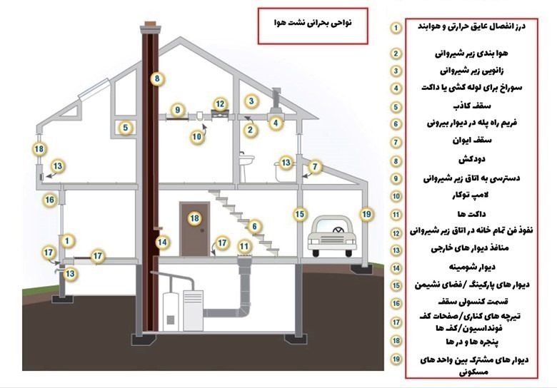 در شکل زیر نقاط و نواحی از ساختمان با پتاسیل نشت هوا نشان داده شده است:
